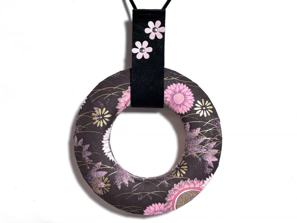 千代紙弦巻ーチョコレート色にひまわりや菊のお花+黒にピンクのお花の下げ革セット